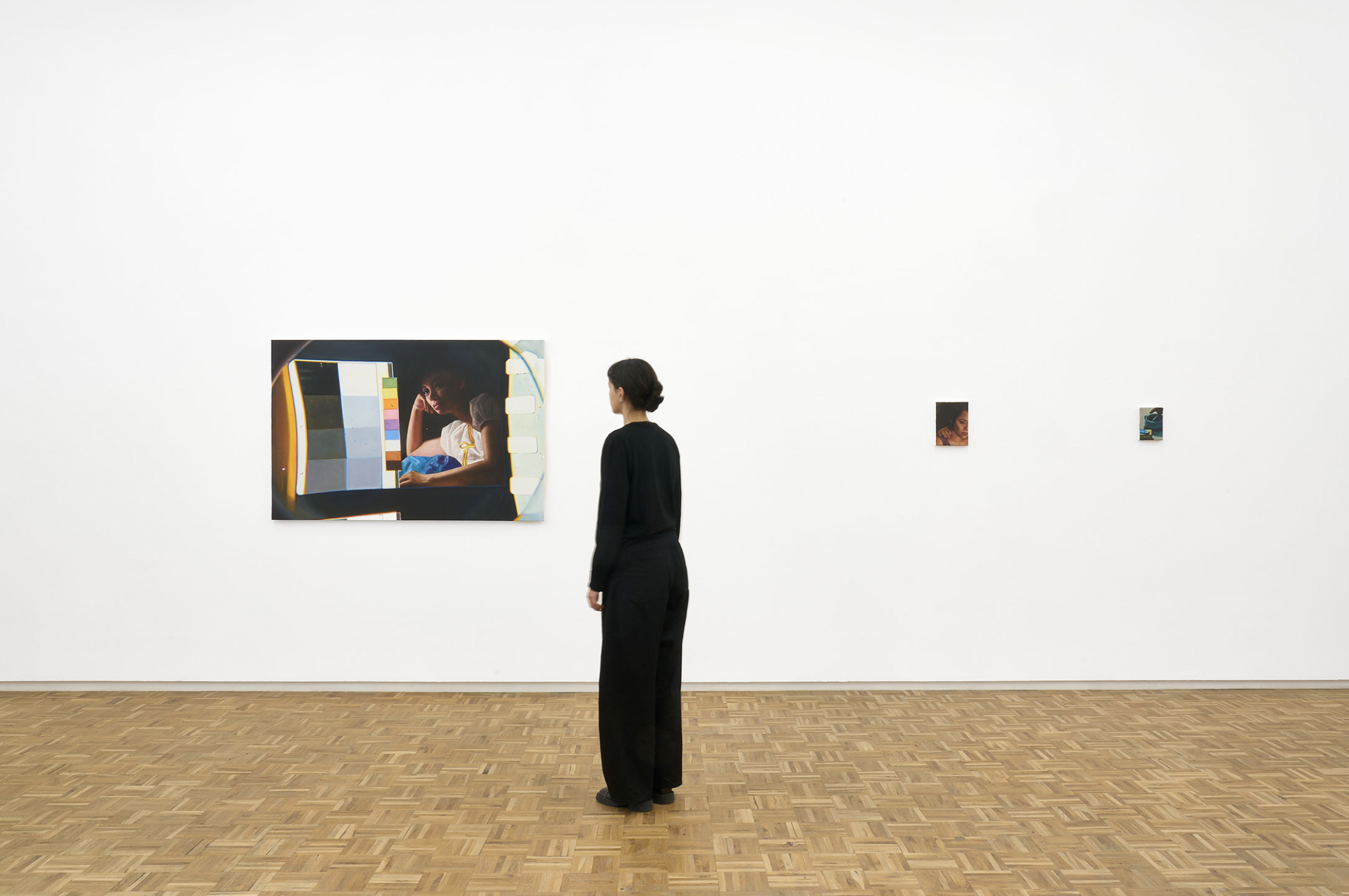 This speculative mode becomes even more pronounced in the exhibition’s second body of work, where she introduces visual systems once used in film calibration. Known as “leader ladies,” these archival test images—used for colour grading in film labs—appear alongside cinematic fragments in new composite compositions. Elements once intended for technical measurement—grids, scales, calibration charts—are absorbed into the visual language of painting. Their original function is dissolved, reconfigured into formal, narrative, and symbolic structures. The logic of the film lab becomes material for the canvas.